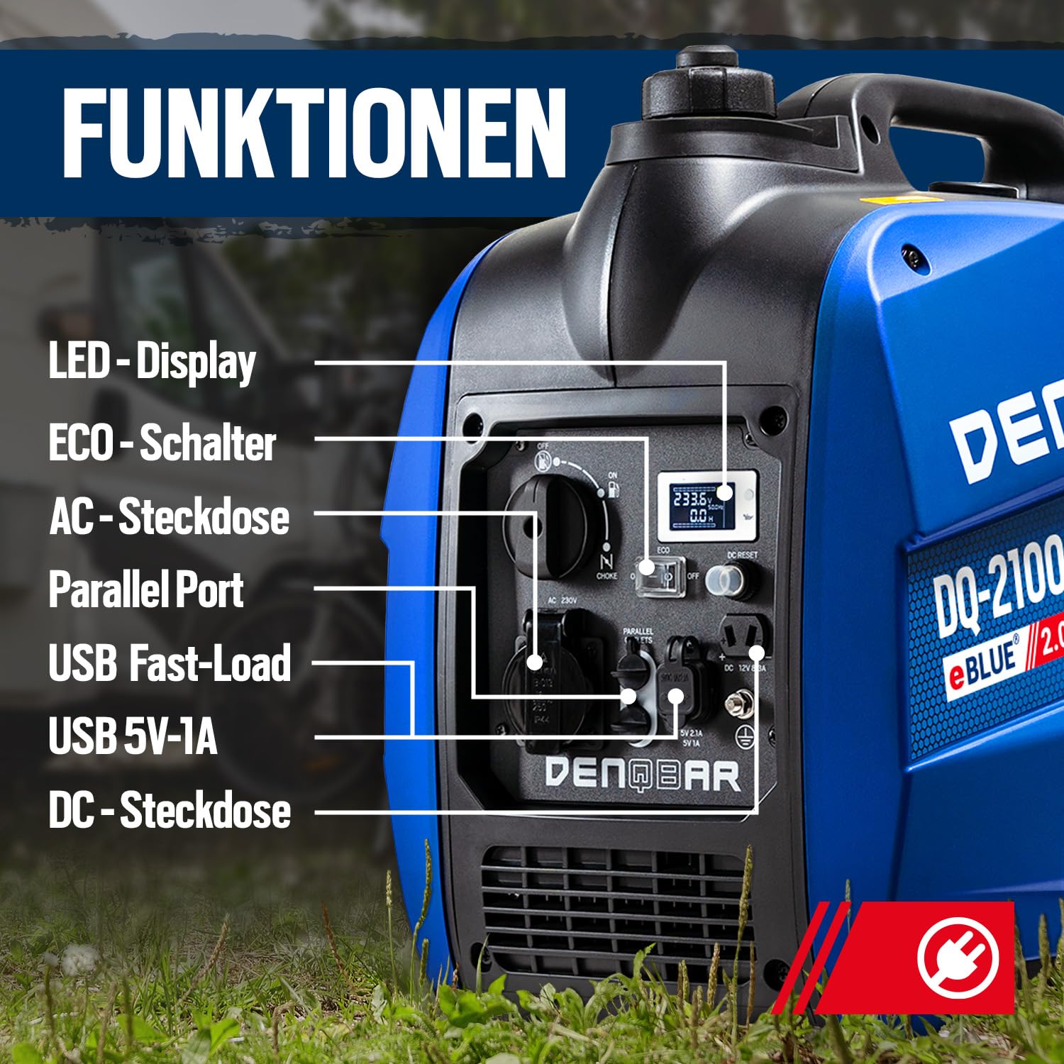 DENQBAR Inverter Stromgenerator DQ-2100 2100W, Benzin Stromerzeuger mit 230V, USB Fast-Load, Superleise, LED Display, tragbar - Für Camping, Outdoor, Baustelle, Reise, Wohnmobil und Notstromaggregat