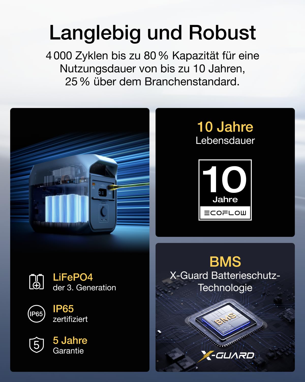 - [DELTA 3 unterstützt DELTA Pro 3, DELTA 2 Max und DELTA 2 Zusatzbatterien und kann auf bis zu 5 kWh erweitert werden. Hergestellt mit robusten LiFePO4-Zellen, die 10 Jahre lang 4 000 Zyklen bis zur Erreichung von 80 % Kapazität bieten. Die IP65 Zertifizierung und BMS (X-Guard Batterieschutz-Technologie) gewährleisten lang anhaltende Leistung und Sicherheit.